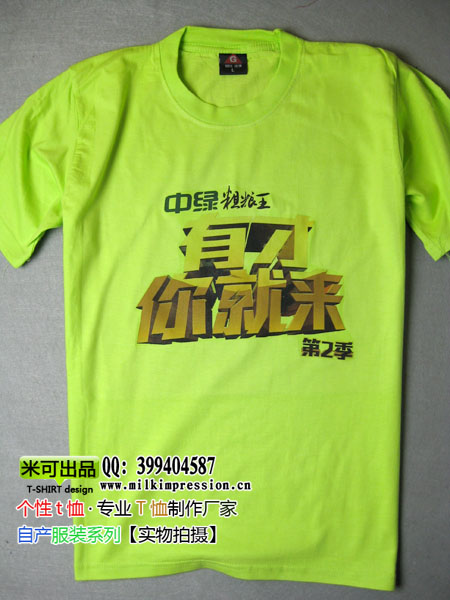 简介:中绿粗粮王--有才你就来栏目组定做的活动文化衫,用热转印技术印制的t恤,因为空白t恤底衫为绿色,所以整个图案印出来偏绿。