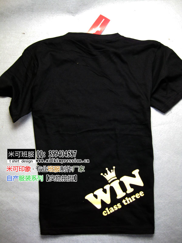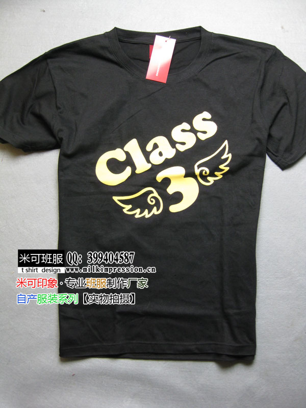 简介:广东深圳福田实验学校3班班服展示,同样是黑色的班服款式,正面是围绕3班的班服图案设计,背后衣服下摆同样是以3班为主题的班服图案,整体图案采用金黄色印制以搭配黑色t恤。
