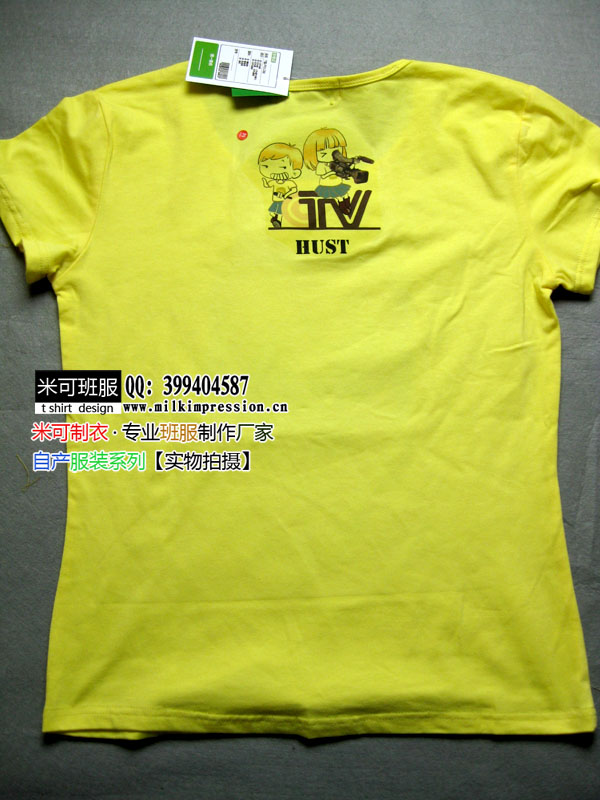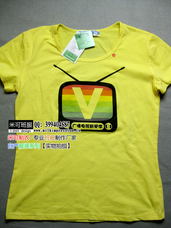 简介:广播电视新闻学班服案例,用高档精梳棉制作的浅黄色班服,可爱的卡通造型加上摄影机的效果,突出了新闻学专业的特点,胸前主图是彩色电视机,背后的班徽logo是男孩与女孩组合而成的个性图案。