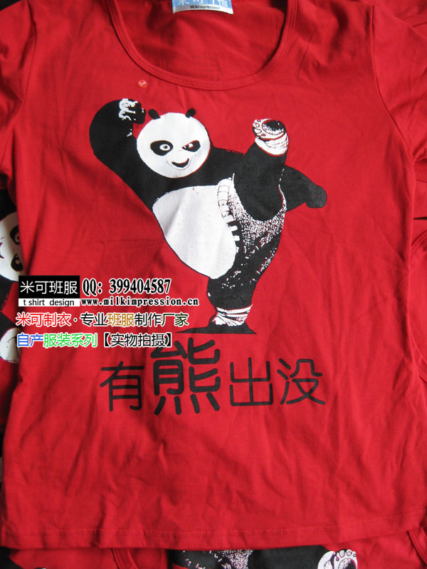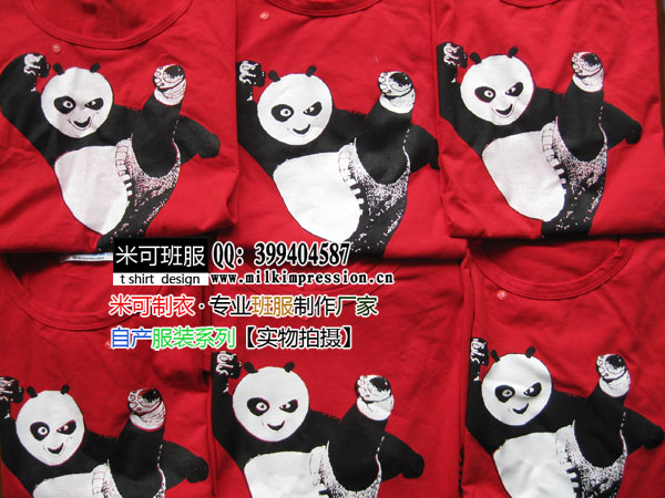 简介:南昌新建二中的同学们定做的班服,以可爱的功夫熊猫为载体设计的班服图案,大红色的空白t恤很好的搭配出了熊猫的特色,也烘托出了班级文化。
