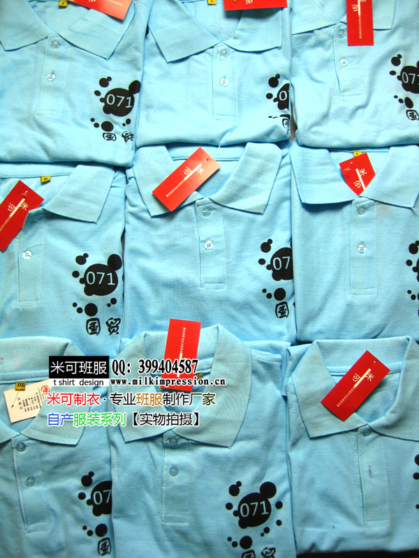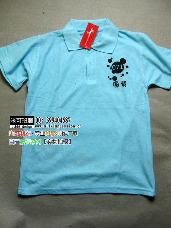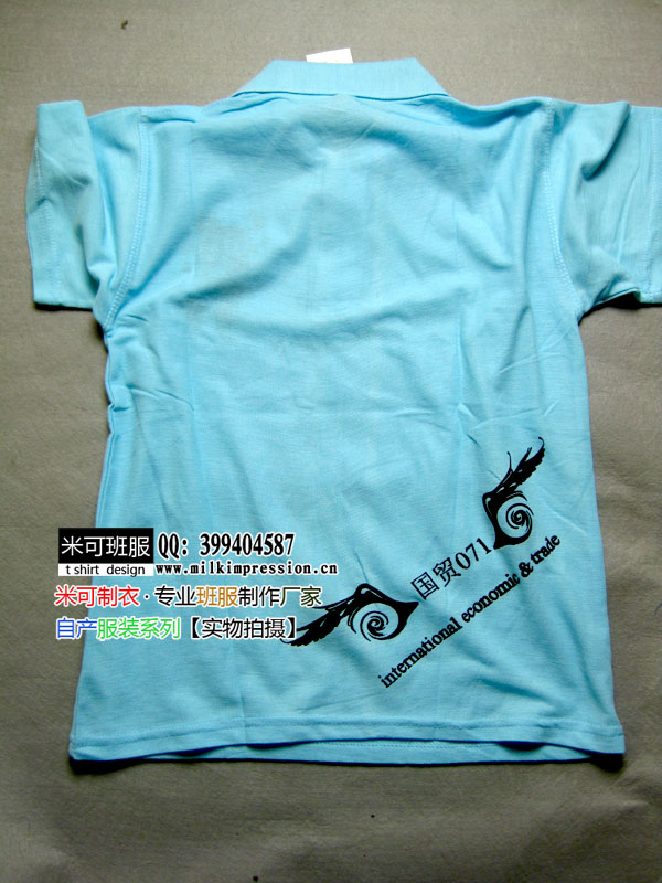 简介:江西农业大学07国贸班定做的班服,湖蓝色的翻领polo衫,黑色的班服图案