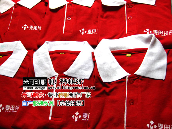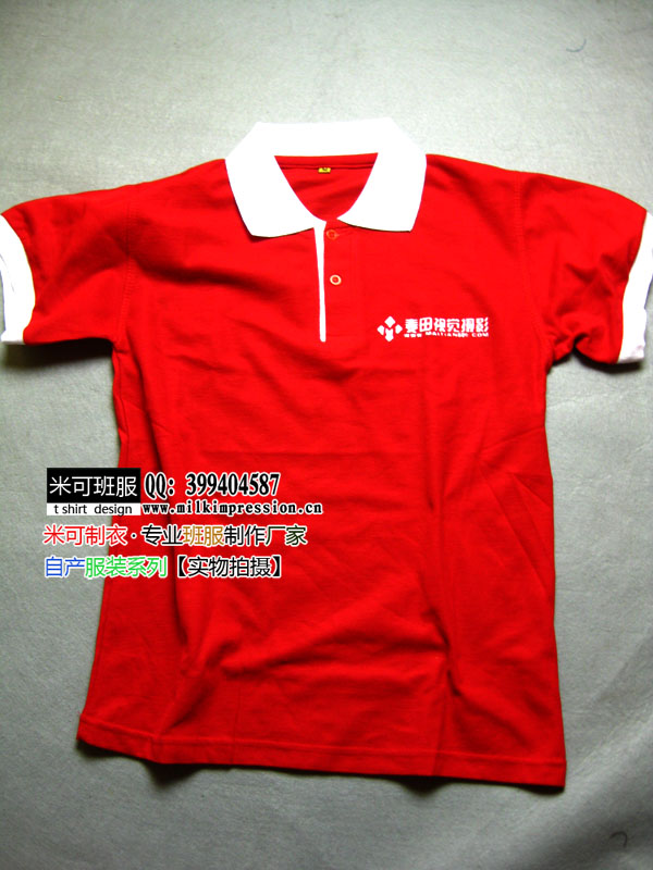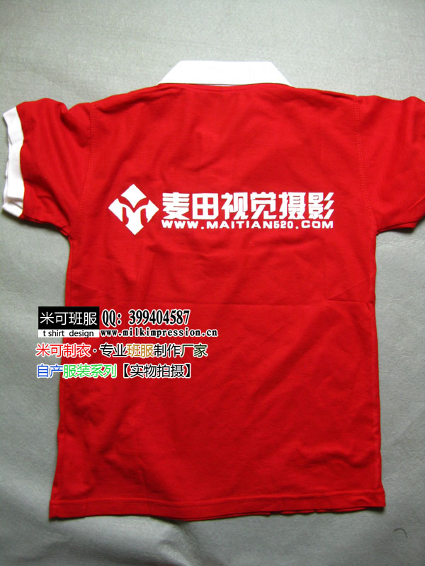 简介:麦田视觉摄影馆定做的工作服,红色衣身,白色领口的高档翻领polo衫,图案印制以摄影馆logo为主题。