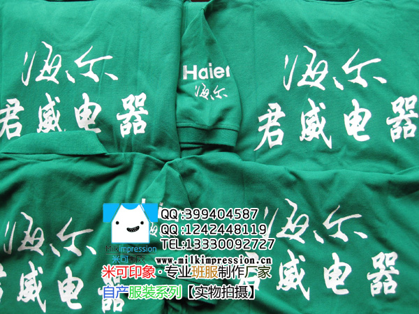 简介:海尔集团为庆祝君威电器定做的团体服,用深绿色珠地棉材质的高档翻领polo衫做底衫,印制海尔的企业logo。