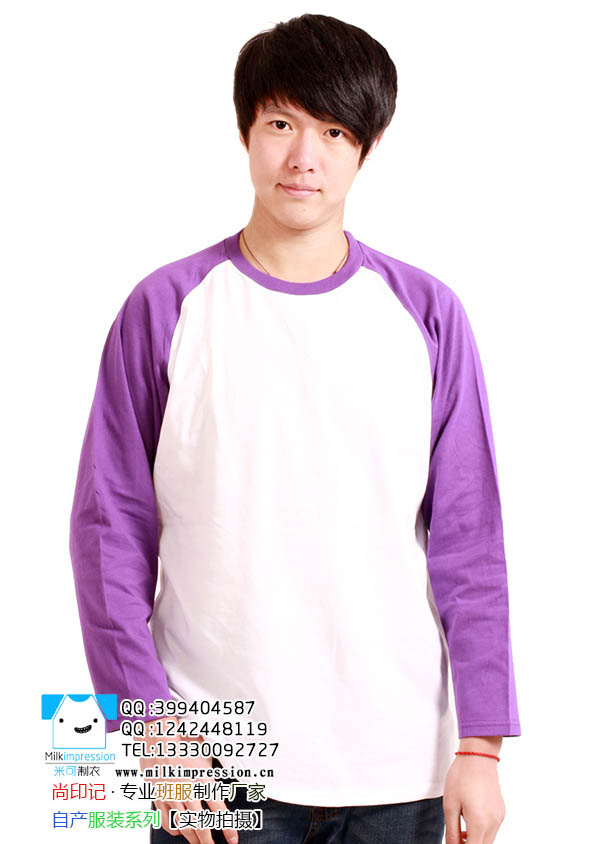 200克紫色插肩款长袖空白T恤-文化衫定做-班服